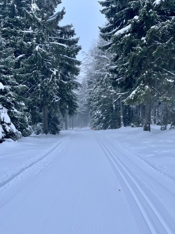 Dnes parádne bežkovanie na všetkých tratiach v okolí štadióna okrem Dolnej 4-ky a 1km okruhu pod štadiónom. Upravené 2-jka, 3-jka, Horná 4-ka a 5-ťka. Na úseku 5-ky v horných častiach Kiarov trochu znečistené ale stále v pohode prejazdné. Tobogán zľadovatený, tam treba opatrne. Dávnejšie bola upravená aj Dolná 4-ka ale tú som neprešiel, z informácií viem, že stúpanie pod štadiónom má pre nedostatok snehu obmedzené podmienky s kamením. Prešiel som aj od Bystrického sedla smerom hore cez Silvestrovskú skratku. Úsek od Bystrického sedla pod tobogán neupravený ale ujazdený sa dá v pohode aj prekorčuľovať.Foto z úseku cez stredný Kiar.