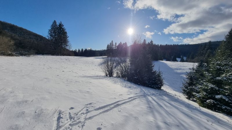 Lúky v okolí Krpáčova pokryté vrstvou čerstvého ľahkého prašanu (~8-12cm) čo akurát stačilo na pohyb v stope. Občas to išlo až na podklad,takže na nové bežky to zatiaĺ nie je.