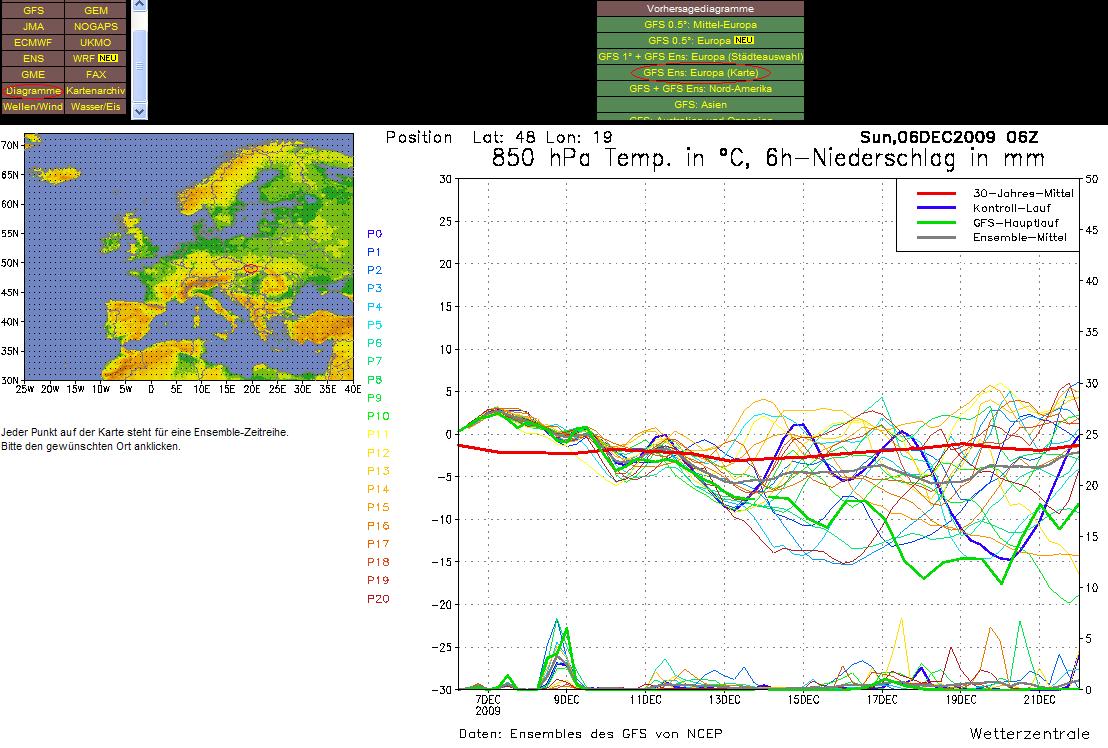 Na obrázkoch dolu sú na porovnanie predpovedné mapky pre 17.12. 2009 z ktorých prvá mapka je zo 6.12.2009 o 6:00 hod. zobrazuje vpád studeného vzduchu na naše územie ale druhá, ktorá je z 12:00 hod. už znázorňuje oteplenie v našej oblasti a studený vzduch zo severu smeruje západne od nás. Táto situácia len potvrdzuje aké sú nepresné dlhodobé predpovede. Na ďalších obrázkoch sledujte ako sa s časom menia predpovedné mapky pre deň 17.12.2009.