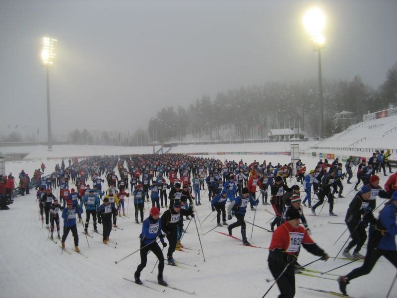 V nedeľu boli na programe preteky klasickou technikou na 42 km a 20 km a ich začiatok už o 9:30 hod. Poučení z predchádzajúceho dňa a vzhľadom na skorý začiatok súťaží sme vyrazili z miesta ubytovania o siedmej hodine aby sme mali istotu, že sa nám podarí zaparkovať pri štadióne. Náš úsudok bol správny a tak sme po dorazení na parkovisko zostali v autách ešte asi hodinu a pol. V noci a poceste pomerne husto pršalo a tak sme s obavami sledovali, či sa so stúpajúcou výškou dážď zmení aspoň na sneženie alebo ustane úplne. Až tesne pred cieľom sa do dažďa začali miešať snehové vločky a postupne už miestami husto snežilo. Bolo jasné, že odskúšané mazanie z predošlého dňa bude treba prehodnotiť. Našťastie nezačalo pršať a aj keď počas preteku miestami husto snežilo, tak to bolo prijateľnejšie ako dážď. Štart aj nedeľných súťaží bol organizovaný vo vlnách, takže po štarte nevznikala žiadna tlačenica tak ako sme zvyknutí z iných behov vrátane Bielej stopy. Navyše hneď za zákrutou od štartu sa trať rozširuje. Počas pretekov bolo dosť nepríjemné počasie, keď na niektorých miestach sa k hustému sneženiu pridal aj nepríjemný vietor a miestami aj hmla. Teplota sa pohybovala okolo nuly. Mazalo sa teda tekutými voskami.