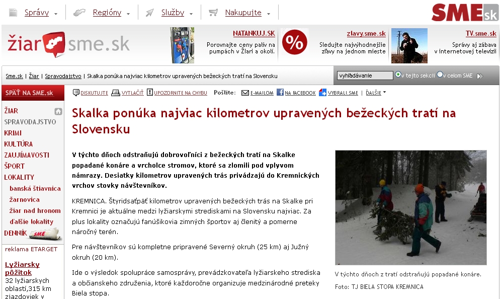 „17.1.2012 15:00 h. Stav snehu na Skalke 125 cm (merané na Frajungoch v zavetrí). Nakoľko dnes bolo na mobile BS Trate množstvo nepríjemných telefonátov ohľadom úpravy bežeckých tratí, píšem niekoľko vysvetlení pre nezaineresovaných bežkárov. TJ Biela stopa nemá vlastný mechanizmus na úpravu tratí a je odkázaná na dodávateľa. K úprave bežeckých turistických tratí (Severný a Južný okruh) máme len poradný hlas. Nemalú úlohu zohrávajú prirodzene financie, zmluvy a priority. Štadión R. Čillíka, inlinovú dráhu a pretekové trate (FIS 5km), kompletne upravuje a zabezpečuje Mestský klub lyžiarov (MKL). Momentálne hľadáme spôsoby a možnosti ako upraviť trate aj pre víkendom.